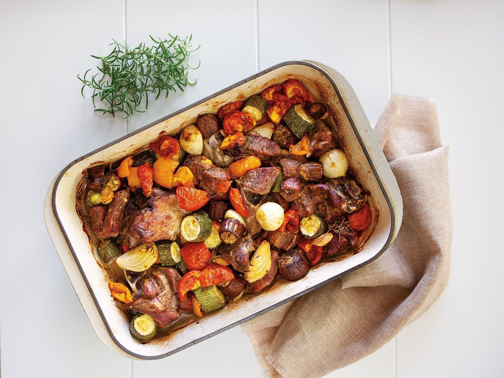 Υλικά 2 κιλά αρνί, σε κομμάτια Αλάτι και πιπέρι Φρέσκο δεντρολίβανο 1 κιλό λαχανικά διάφορα (μελιτζάνες, κολοκυθάκια, κρεμμύδια, πιπεριές) 30…