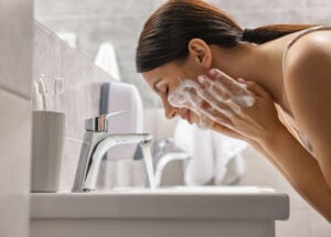 Διάλεξε ήπιο, ενυδατικό καθαριστικό, χωρίς σαπούνι ή απολεπιστικά. Απόφυγε το καυτό νερό και σκούπισε ταμποναριστά την επιδερμίδα χωρίς τρίψιμο.