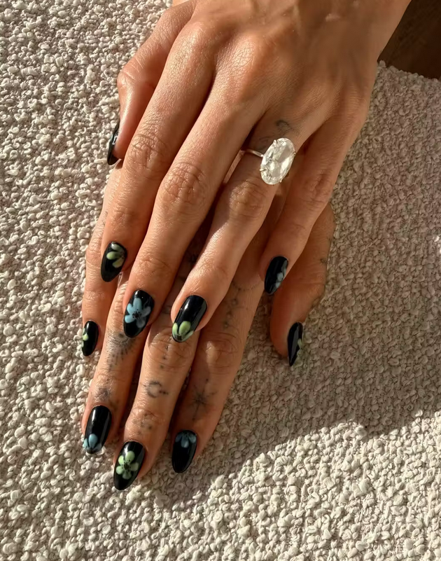 Το νέο της μανικιούρ απέχει πολύ από ό,τι την έχουμε συνηθίσει. Σε μαύρη βάση, “άνθισαν” μικρά λουλούδια ιβίσκου σε έντονες αποχρώσεις μπλε και λαχανί, τοποθετημένα είτε στο κέντρο είτε στις άκρες των νυχιών, δημιουργώντας ένα αποτέλεσμα που ισορροπεί ανάμεσα στο artistic και το edgy. Πίσω από το look βρίσκεται η nail artist Zola Ganzorigt, η οποία αποκάλυψε πως το twist που έκανε τη διαφορά ήταν η χρήση ειδικής πούδρας που φωσφορίζει στο σκοτάδι.