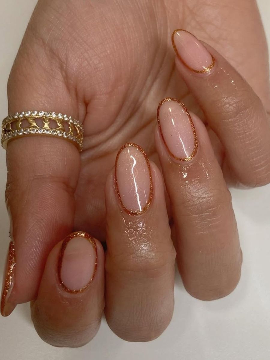 Μια cinnamon sugar glitter γραμμή “αγκαλιάζει” όλο το περίγραμμα των νυχιών ενώ μια nude βάση με ελαφρώς sparkly touch, χαρίζει ισορροπία. So festive!