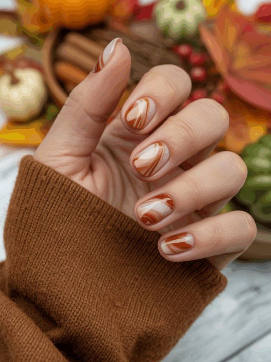 Αυτό το μανικιούρ είναι πραγματικά σαν να να βλέπεις έναν ανακατεμένο, ζεστό καπουτσίνο με κανέλα ή ένα λαχταριστό cinnamon roll. Τόνοι λευκού, καφέ και κεραμμυδί ανακατεύονται δημιουργώντας ένα αναπάντεχο και μοντέρνο nail art.