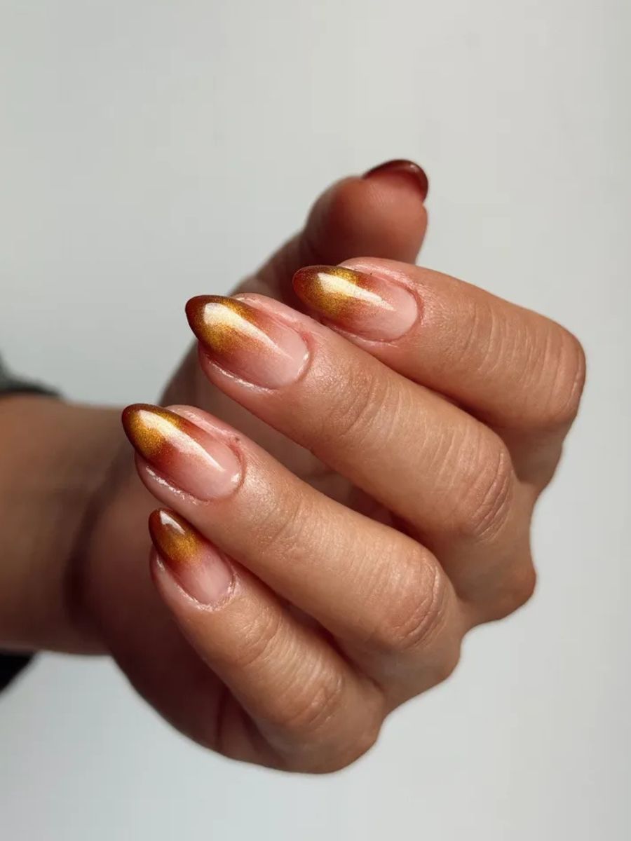 O oρισμός του κομψού, αλλά ταυτόχρονα γιορτινού μανικιούρ: cinnamon sugar με ανάποδο ombre με smooth σβησίματα και χρυσό λεπτεπίλεπτο γαλλικό στις άκρες και στην κορυφή των νυχιών.