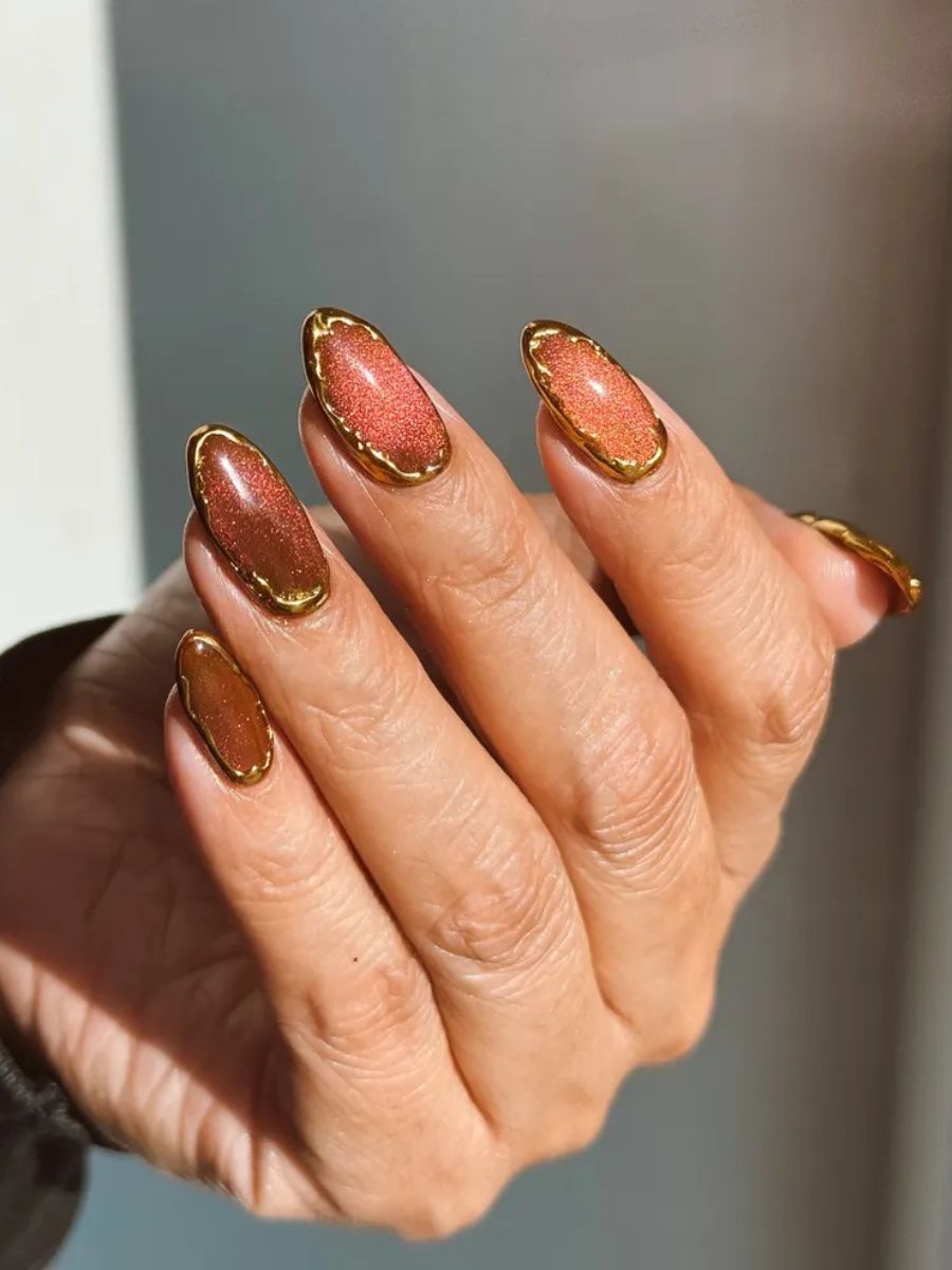 Αν αγαπάς τα μαξιμαλιστικά σχέδια ο πιο ενδιαφέρον τρόπος να υιοθετήσεις το cinnamon sugar trend είναι με cat-eye effect, glitter φινίρισμα και ανάγλυφες χρυσές λεπτομέρειες.