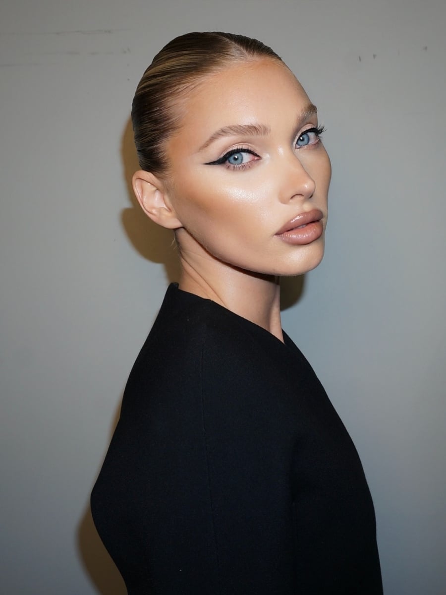 Eyeliner: Η Elsa Hosk σου δείχνει τον τρόπο. To winged liner είναι εξαιρετικά έντονο ενώ η shimmer παστέλ σκιά δημιουργεί μια απίθανη αντίθεση. Τα ζυγωματικά είναι επίσης τονισμένα όπως και τα χείλη που έχουν glass φινίρισμα και πιο σκούρο περίγραμμα.