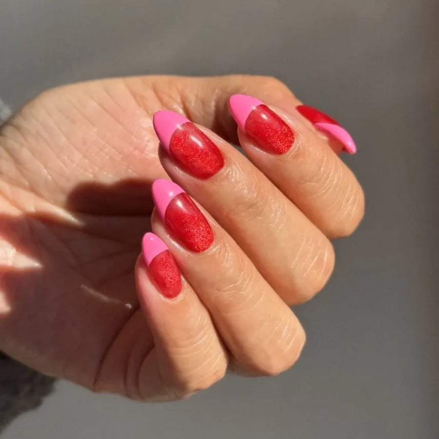 Vibrant: Η κόκκινη cat-eye βάση με το έντονο ροζ χρώμα στα tips δημιουργού την τέλεια αντίθεση.