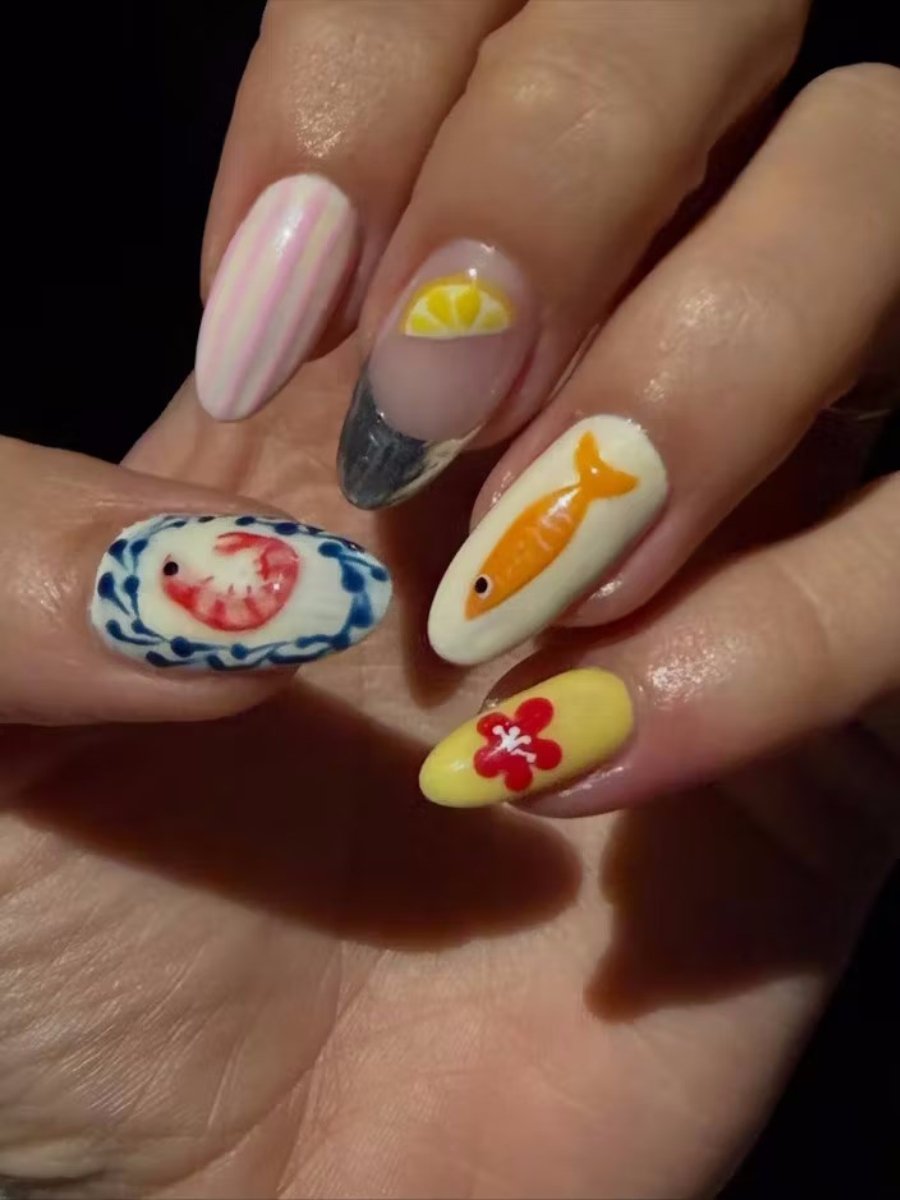• Αντί για το συνηθισμένο minimal στυλ, επέλεξε ένα παιχνιδιάρικο nail art εμπνευσμένο από το «seafood palette».