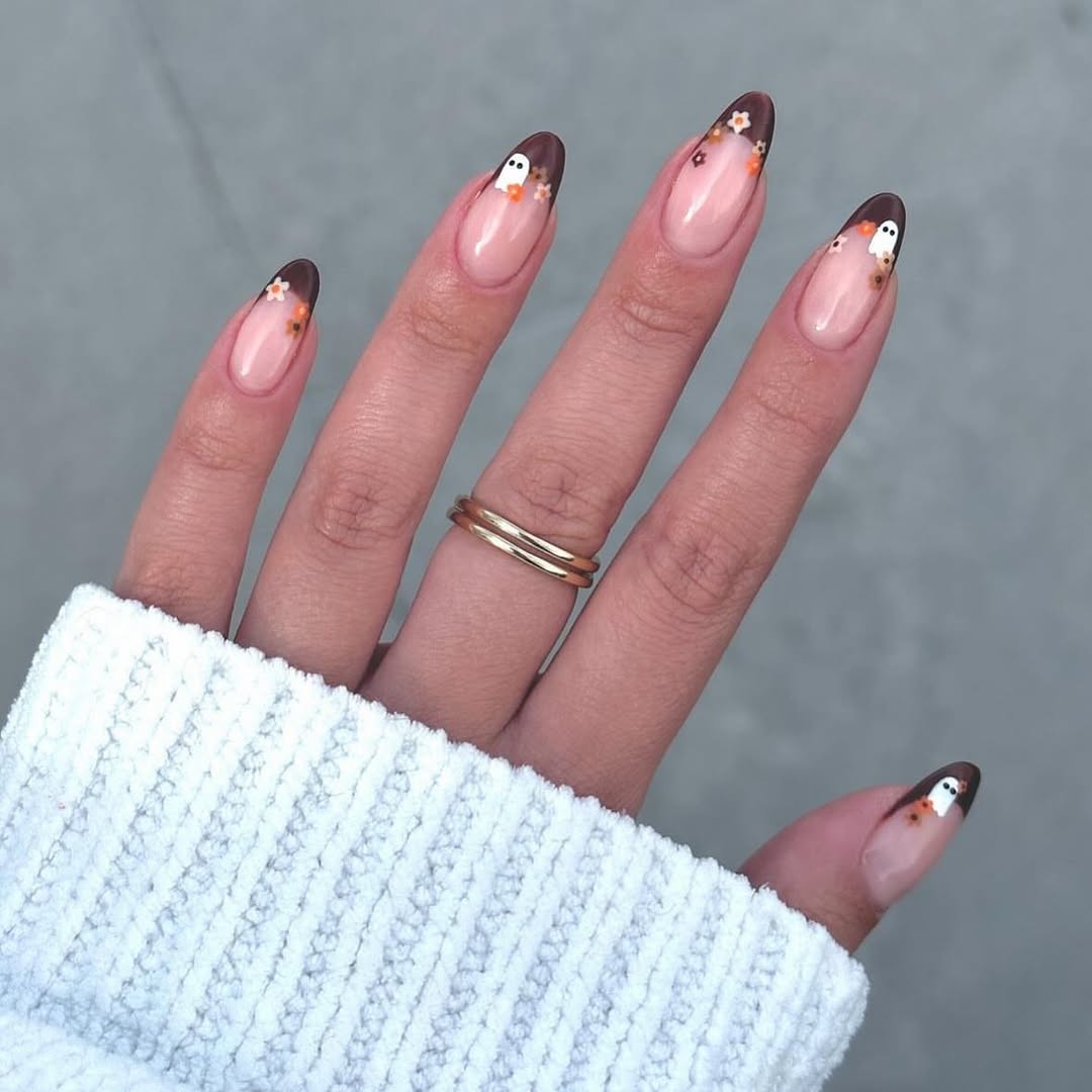 Γαλλικό μανικιούρ σε καφέ, φθινοπωρινές αποχρώσεις, διακοσμημένο με μικροσκοπικά λουλούδια και παιχνιδιάρικες φιγούρες-φαντάσματα – μια υπέροχα χαριτωμένη εκδοχή για Halloween νύχια!