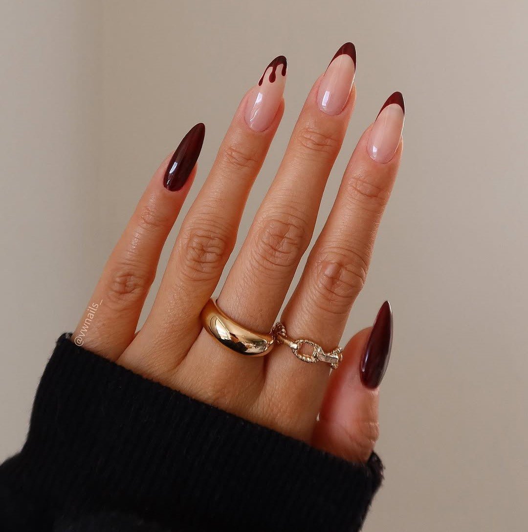 Για τις πιο τολμηρές ψυχές, τα «blood drip nails» είναι η απόλυτη Halloween δήλωση. Βάψε τα νύχια σου σε βαθύ κόκκινο ή μπορντό και δημιούργησε την ψευδαίσθηση σταγόνων αίματος που «τρέχουν» από την άκρη. Το αποτέλεσμα είναι σκοτεινά glam, σέξι και απόλυτα εντυπωσιακό – σαν να βγήκες από μια ταινία τρόμου με στυλ.