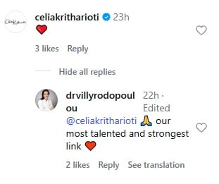 «Ο πιο ταλαντούχος και δυνατότερος σύνδεσμός μας» σχολίασε η πλαστική χειρουργός Βίλλυ Ροδοπούλου στο Instagram απευθυνόμενη στη Celia Kritharioti για τη στενή σχέση των τριών γυναικών.