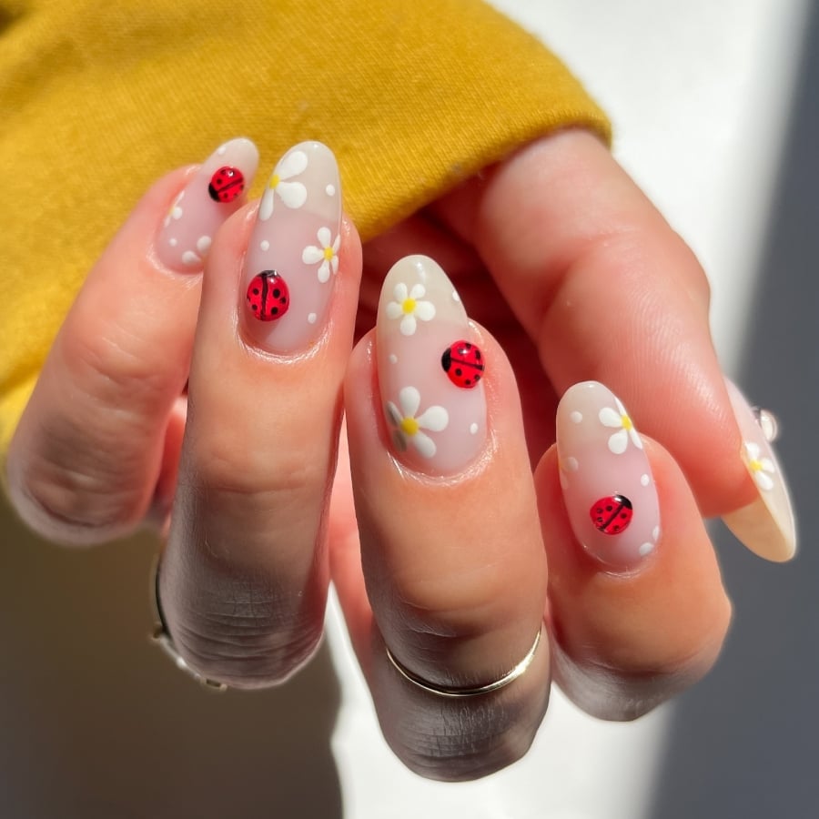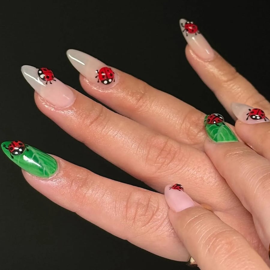 Δύο νύχια έχουν εφέ φύλλου, τα υπόλοιπα ροζ και λευκή βάση και οι πασχαλίτσες είναι 3D. Ένα μανικιούρ ιδανικό για μακριά νύχια.