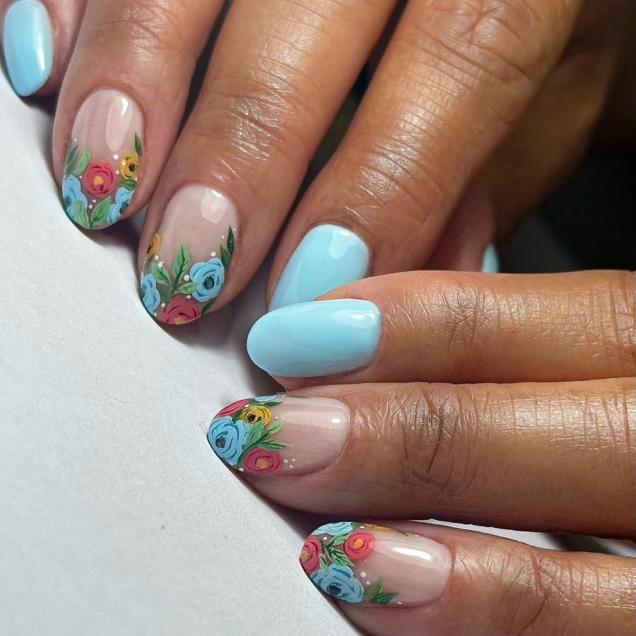 Τα τριαντάφυλλα στα tips θυμίζουν πίνακα ζωγραφικής ενώ η βάση είναι σε κάποια νύχια baby blue και σε κάποια nude.