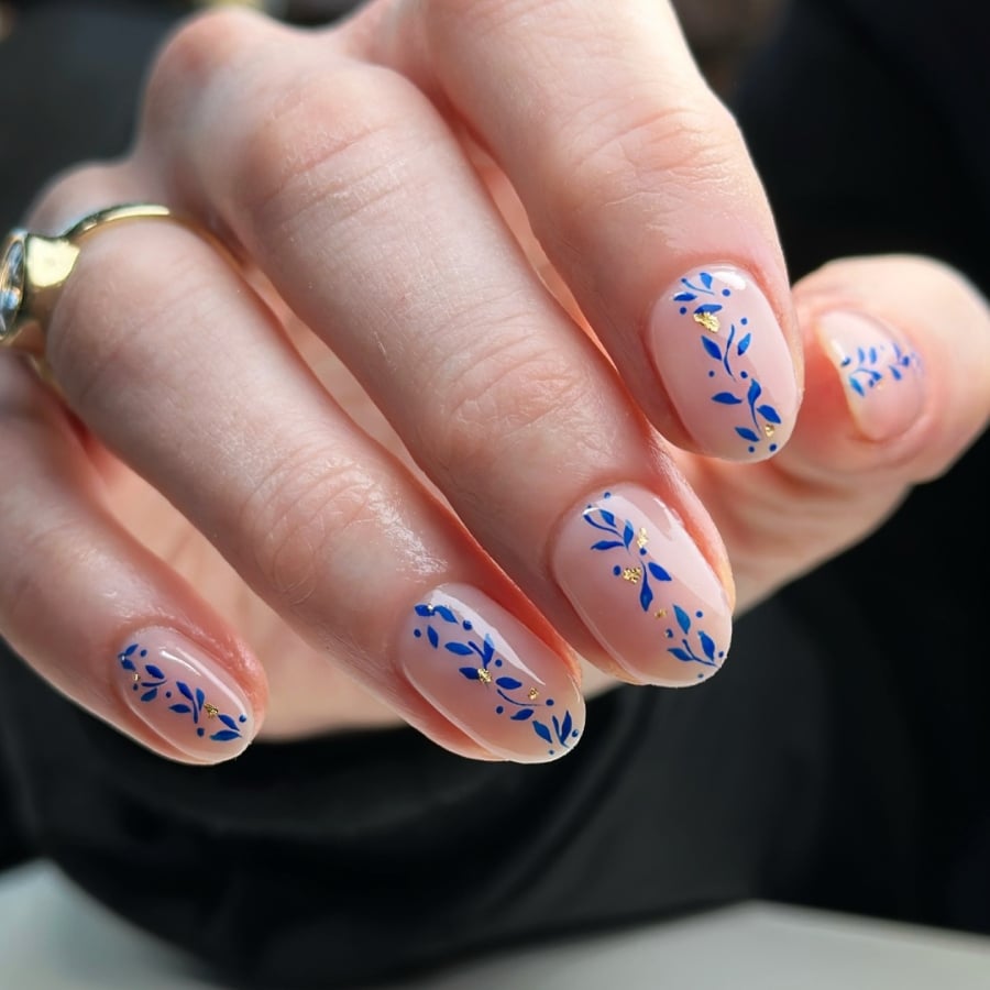Κομψό και υπέροχο. Τα navy blue πέταλα απλώνονται κάθετα στα νύχια. Τα διακριτικά φύλλα χρυσού χαρίζουν μια minimal glam πινελιά.