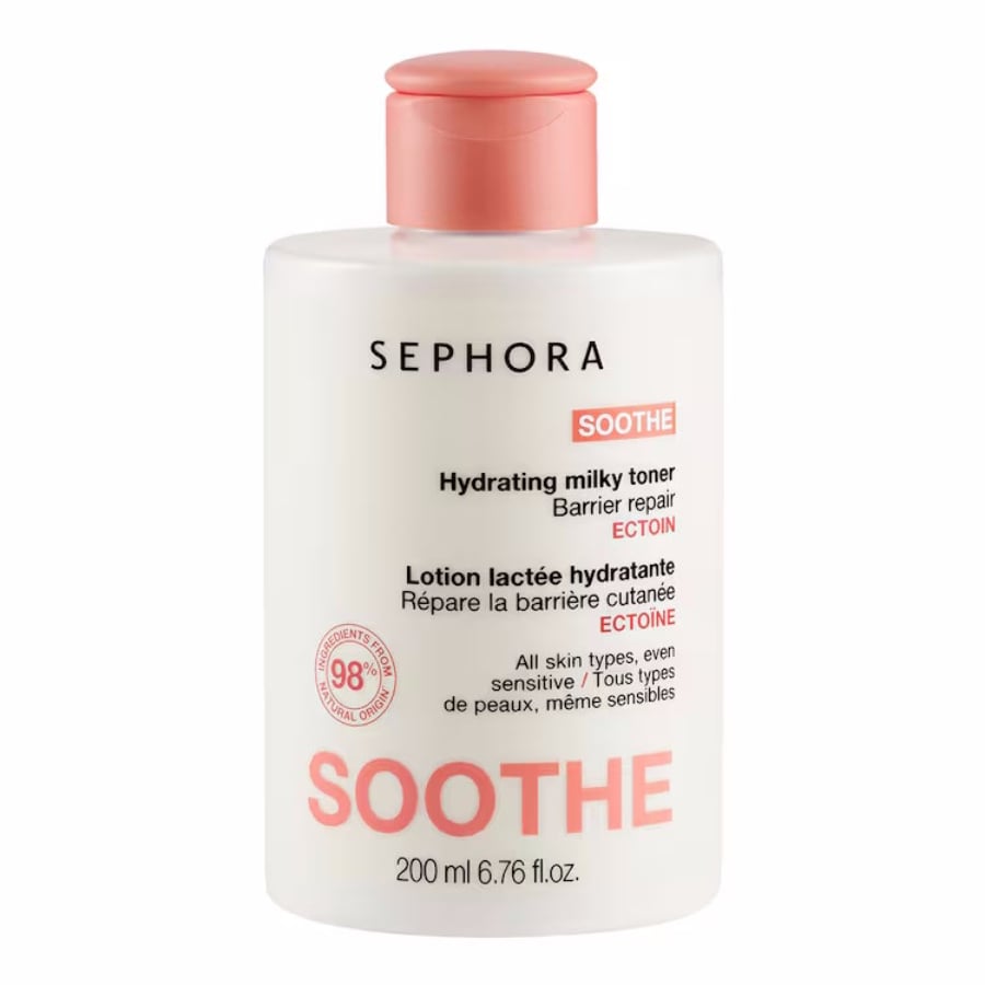Sephora Soothe Hydrating Milky Toner:  Ενυδατική λοσιόν γαλάκτωμα, εμπλουτισμένη με Εκτοΐνη που επανορθώνει τον δερματικό φραγμό και καταπραΰνει άμεσα την αίσθηση τραβήγματος. Κατάλληλη για όλους τους τύπους δέρματος, ακόμη και το ευαίσθητο, μειώνει την εμφάνιση ερυθρότητας ενώ παράλληλα χαρίζει άμεση ενυδάτωση.