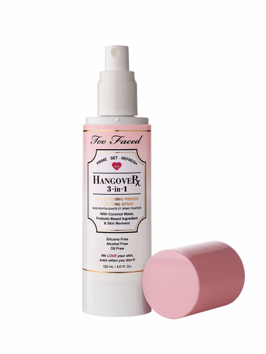 Hangover 3-in-1 Replenishing Primer & Setting Spray: Εμπλουτισμένο με νερό καρύδας, προετοιμάζει, φιξάρει και φρεσκάρει το μακιγιάζ ενώ διατηρεί την επιδερμίδα πλούσια ενυδατωμένη.
