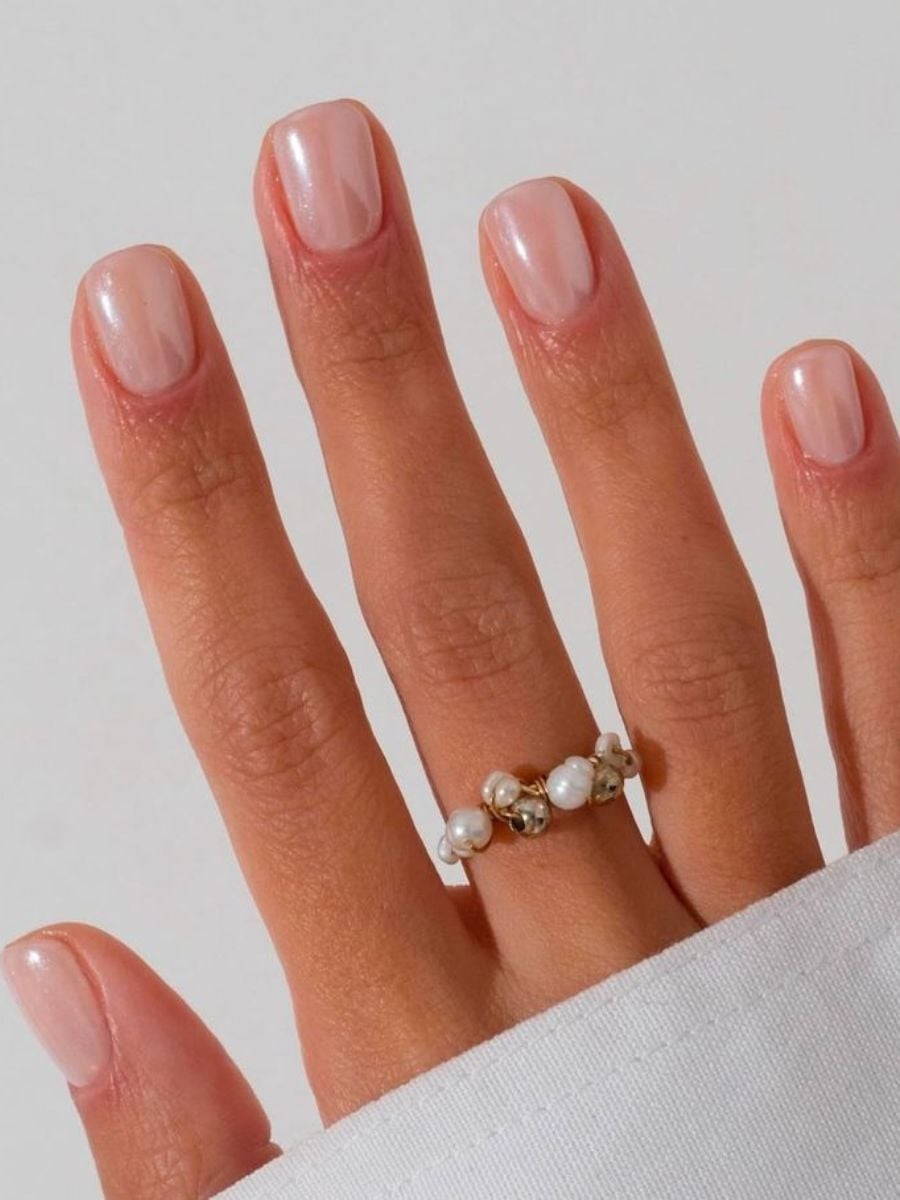 Αν θέλεις μια φυσική απόχρωση αλλά με μια μικρή ανατροπή, δοκίμασε ένα shimmer βερνίκι. Αντί για αδιαφανή, μεταλλικά ή frosted φινιρίσματα, προτίμησε ημιδιάφανες συνθέσεις με διακριτικά περλέ σωματίδια. Προσθέτουν υγιή λάμψη, κάνουν τα νύχια να δείχνουν πιο φωτεινά και αντανακλούν το φως με φίνο τρόπο.