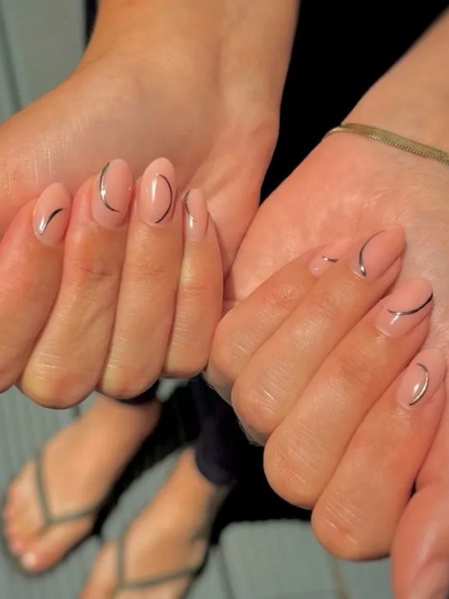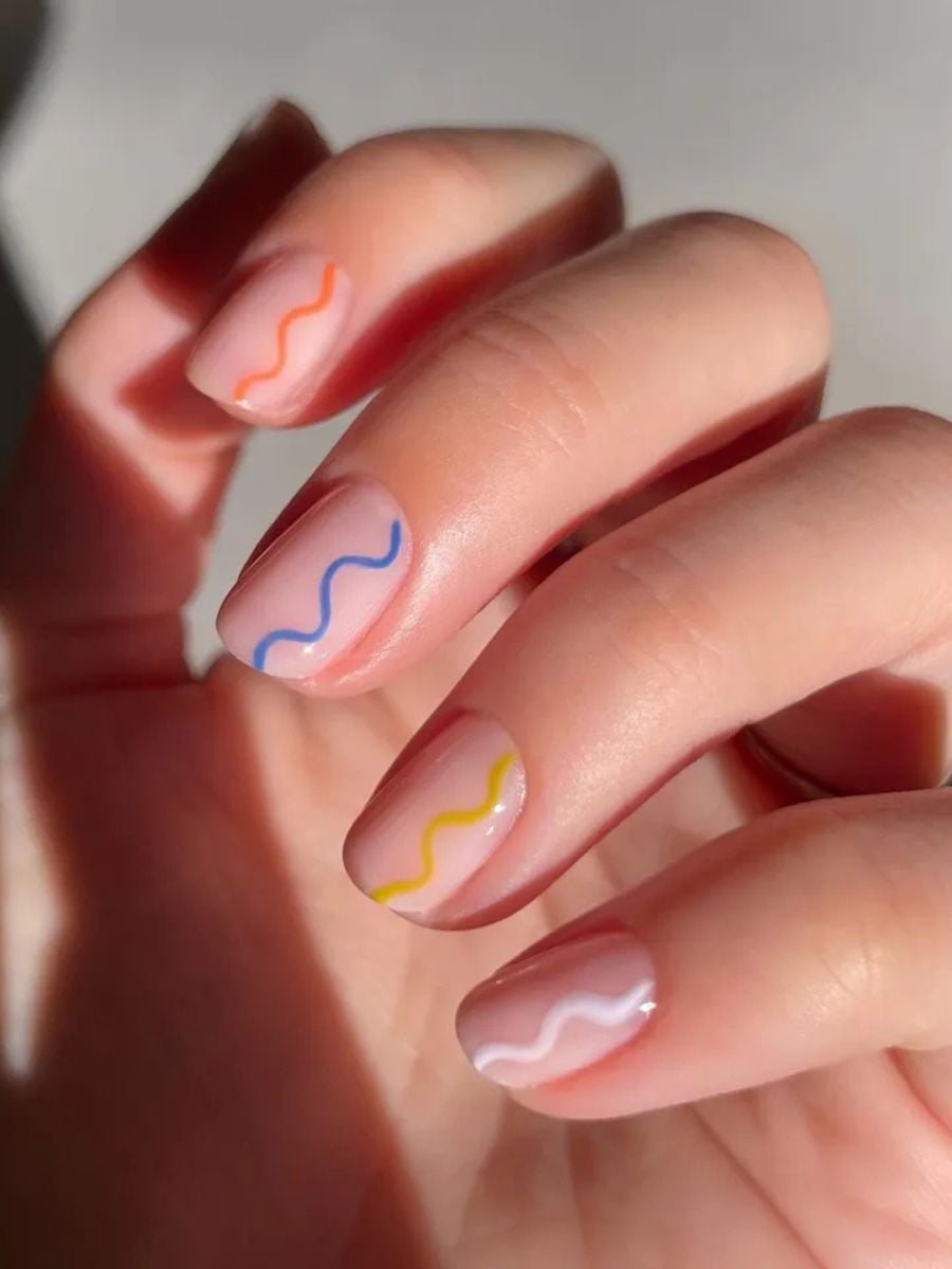 Λεπτές, αφηρημένες γραμμές σε ζωηρά ή παστέλ χρώματα πάνω σε nude βάση προσφέρουν καλλιτεχνικό χαρακτήρα χωρίς να βαραίνουν το αποτέλεσμα. Οι γραμμές μπορεί να είναι κυματιστές, ασύμμετρες ή να διασταυρώνονται, δημιουργώντας κίνηση και ενδιαφέρον. Είναι μια ιδέα που υλοποιείται εύκολα τόσο στο σπίτι όσο και στο nail salon.