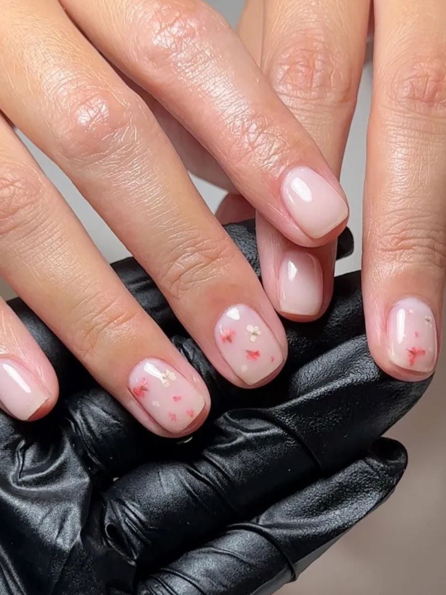 Αποξηραμένα πέταλα λουλουδιών πάνω σε nude βάση δημιουργούν ένα άκρως ρομαντικό και εκλεπτυσμένο αποτέλεσμα. Τα διάφανα ή γαλακτερά nude βερνίκια λειτουργούν σαν καμβάς που αναδεικνύει τις φυσικές αποχρώσεις των πετάλων. Είναι η τέλεια επιλογή για μετάβαση από τον χειμώνα στην άνοιξη, αποπνέοντας φρεσκάδα και διακριτική θηλυκότητα.