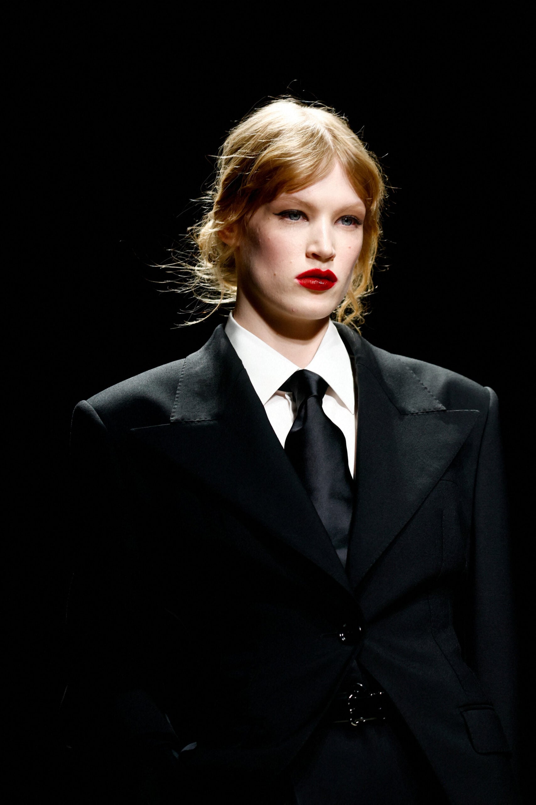 Όσον αφορά τα μαλλιά, το styling παρέμεινε εξίσου κομψό και θηλυκό. Κυματιστά, στιλπνά και άψογα χτενισμένα, έπεφταν απαλά γύρω από το πρόσωπο, ενισχύοντας τη ρομαντική διάθεση του look. Η λάμψη τους αντανακλούσε το φως της πασαρέλας, προσθέτοντας πολυτέλεια και κίνηση.