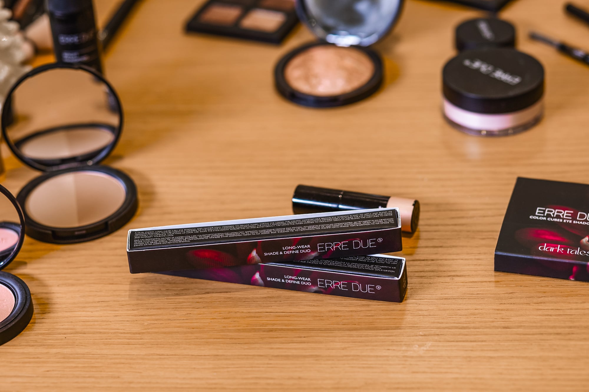 Ξεκινήσαμε με την Color Cube Eyeshadow Palette στην απόχρωση 230 — μια παλέτα από τη νέα fall winter συλλογή Dark Tales της Erre Due που πραγματικά κλέβει την παράσταση. Η ροζ shiny σκιά εφαρμόστηκε σε όλο το κινητό βλέφαρο με ένα all-over πινέλο ώστε να δημιουργήσει αυτή την υγρή, γυαλιστερή λάμψη που «γράφει» υπέροχα τόσο στο φυσικό φως όσο και στα έντονα φώτα ενός γυρίσματος.