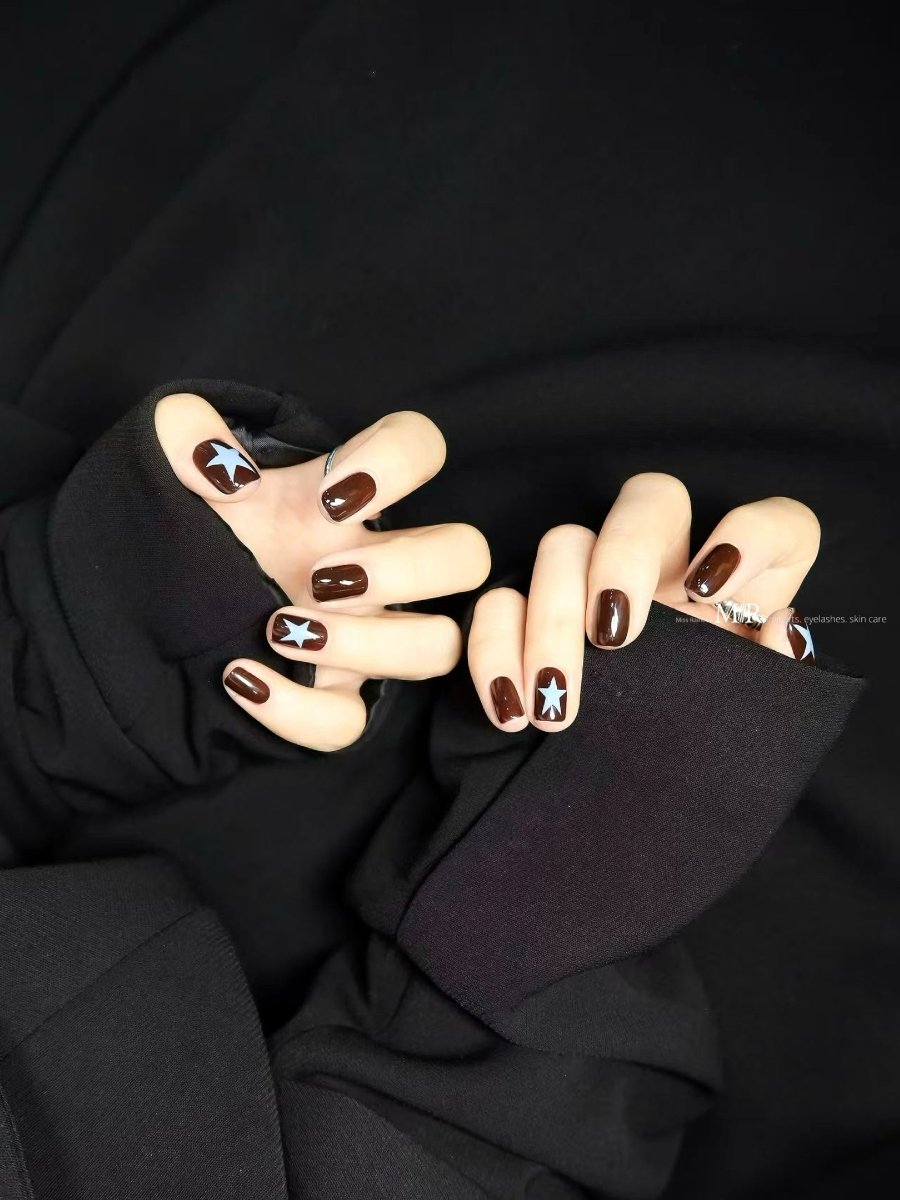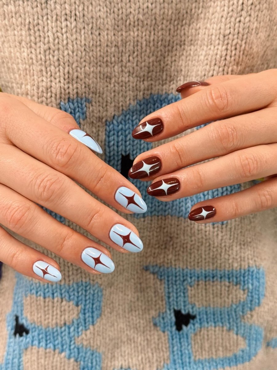 Εντυπωσιακά αστέρια στο κέντρο των νυχιών, σε καφέ και μπλε χρώμα αντίστοιχα.