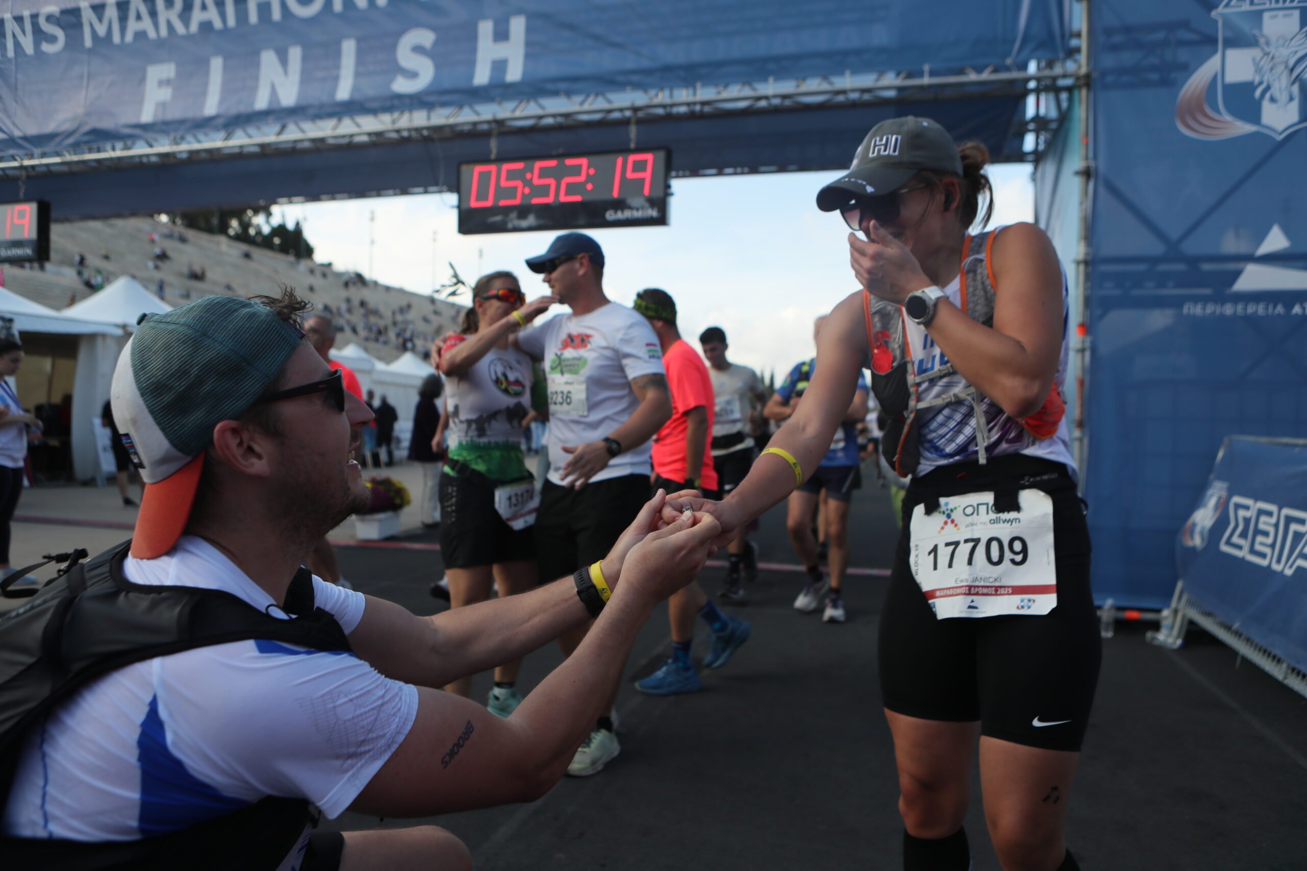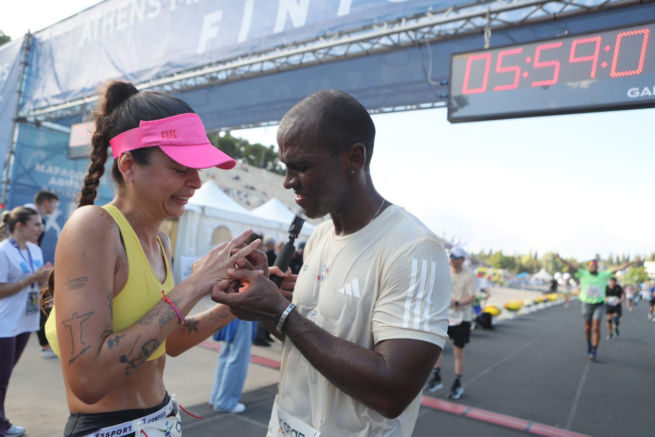 Στον τερματισμό του Μαραθωνίου δεν έλειψαν και οι ευχάριστες εκπλήξεις, αφού συμμετέχοντες έκριναν πως είναι η κατάλληλη στιγμή για να κάνουν πρόταση γάμου στην αγαπημένη τους.
