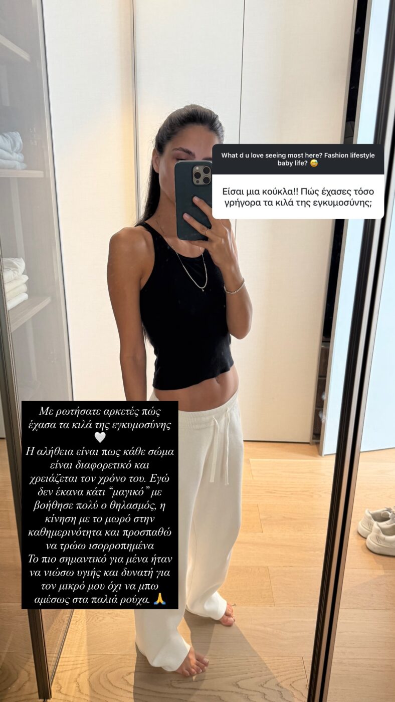 Όσον αφορά στα κιλά της εγκυμοσύνης, η Αλεξάνδρα Νίκα απάντησε: «Η αλήθεια είναι πώς κάθε σώμα είναι διαφορετικό και χρειάζεται τον χρόνο του. Εγώ δεν έκανα κάτι “μαγικό”, με βοήθησε πολύ ο θηλασμός, η κίνηση με το μωρό στην καθημερινότητα και να προσπαθώ να τρώω ισορροπημένα. Το πιο σημαντικό για μένα ήταν να νιώσω υγιής…».