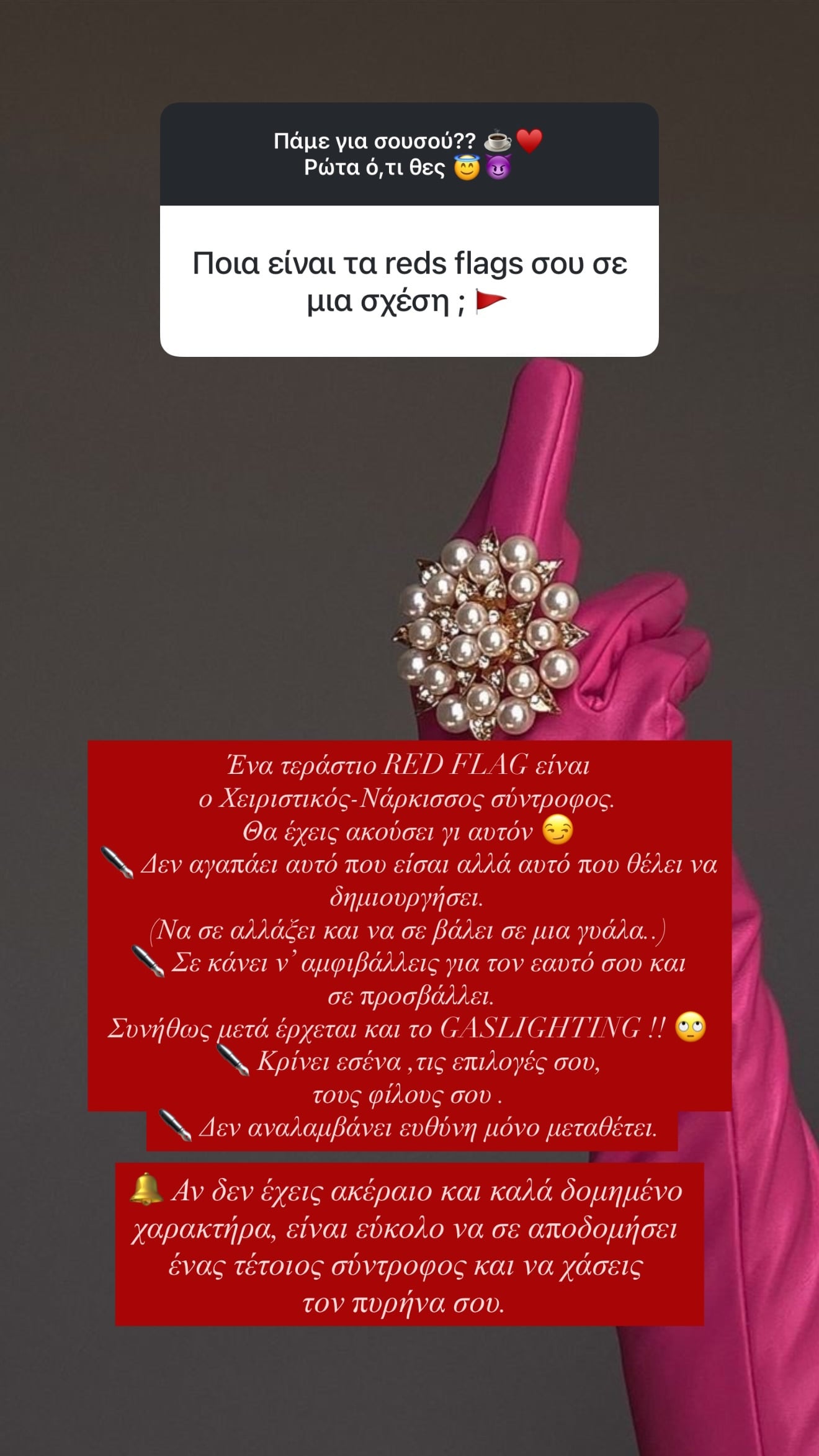 Τέλος η Αλεξάνδρα Παναγιώταρου απάντησε για τα red flags σε μια σχέση τονίζοντας: «Ένα τεράστιο red flag είναι ο χειριστικός-νάρκισσος σύντροφος. Θα έχεις ακούσει για αυτόν…Δεν αγαπάει αυτό που είσαι αλλά αυτό που θέλει να δημιουργήσει. Να σε αλλάξει και να σε βάλει σε μια γυάλα. Σε κάνει να αμφιβάλεις για τον εαυτό σου και σε προσβάλει. Συνήθως μετά έρχεται και το gaslighting. Κρίνει εσένα και τις επιλογές σου, τους φίλους σου. Δεν αναλαμβάνει ευθύνη, μόνο μεταθέτει. Αν δεν έχεις ακέραιο και καλά δομημένο χαρακτήρα είναι πολύ εύκολο να σε αποδομήσει ένας τέτοιος σύντροφος και να χάσεις τον πυρήνα σου».