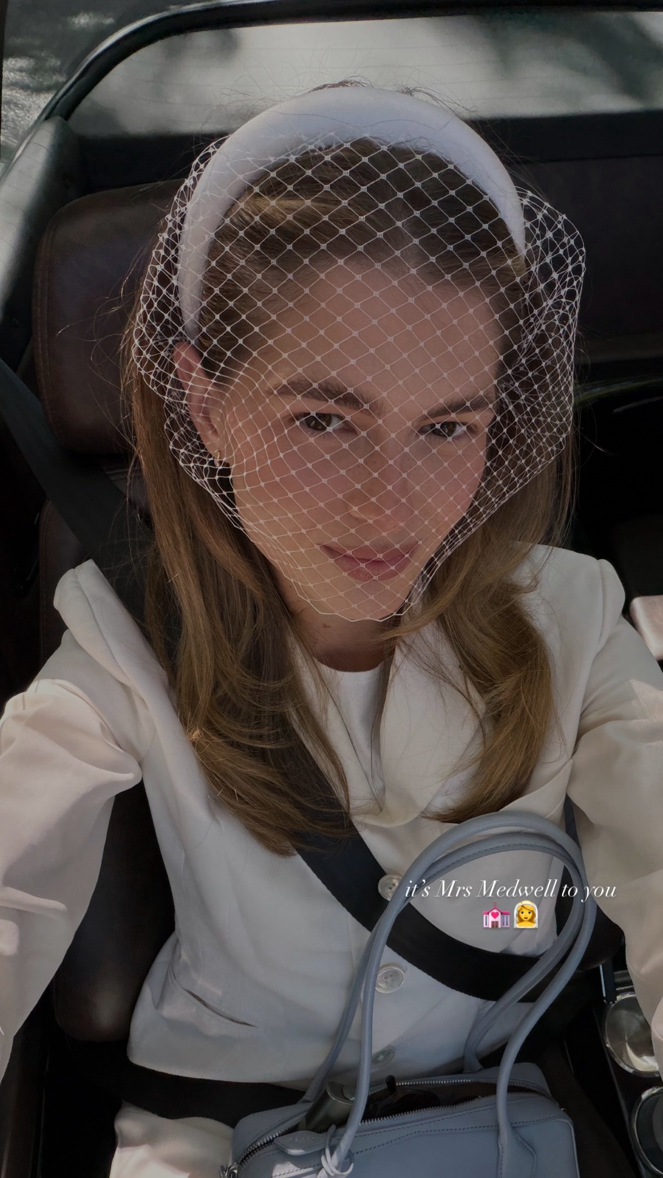 Η Αμαλία Κωστοπούλου έκανε την αποκάλυψη του γάμου της, όταν μοιράστηκε μια φωτογραφία με νυφικό βέλο και κοστούμι γράφοντας στη λεζάντα: «Its Mrs Medwell to you (Κυρία Μέντγουελ για εσάς)».