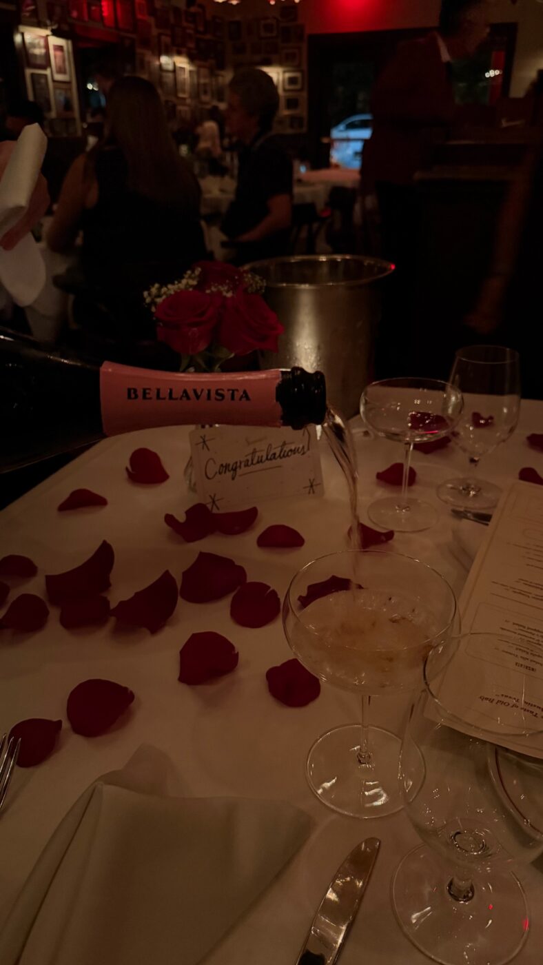 - Το ζευγάρι γιόρτασε με ένα ρομαντικό δείπνο με σαμπάνια και ροδοπέταλα.