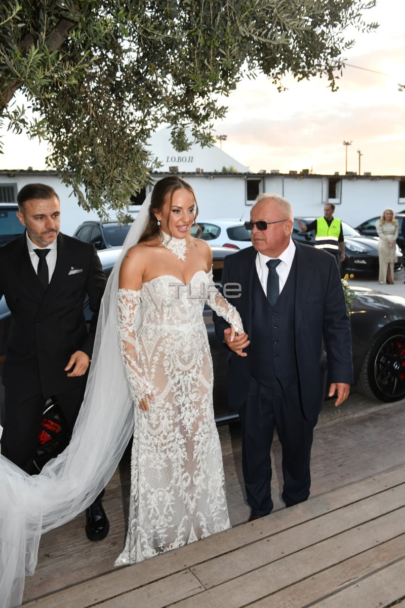 • Η Ανδρομάχη έφτασε στην εκκλησία με τον πατέρα της, ενώ ο Γιώργος την υποδέχτηκε χαρούμενος στα σκαλιά.