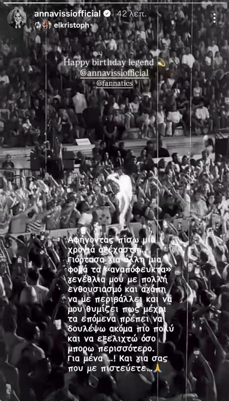 Τα ξημερώματα του Σαββάτου, η Άννα Βίσση έγραψε στα Instagram Stories της: «Αφήνοντας πίσω μια χρονιά αξέχαστη. Γιόρτασα για άλλη μια φορά τα «αναπόφευκτα» γενέθλια μου με πολύ ενθουσιασμό και αγάπη να με περιβάλλει και να μου θυμίζει πως μέχρι τα επόμενα πρέπει να δουλέψω ακόμη πιο πολύ και να εξελιχτώ όσο μπορώ περισσότερο. Για μένα! Και για εσάς που με πιστεύετε».