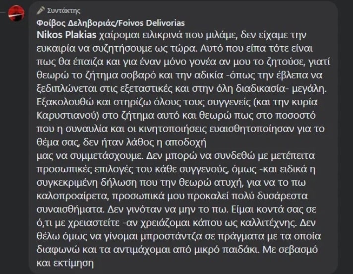 Απαντώντας στο σχόλιο του Νίκου Πλακιά για τον ίδιο, ο Φοίβος Δεληβοριάς ξεκαθάρισε αρχικά πως εξακολουθεί να στηρίζει όλους τους συγγενείς των Τεμπών.