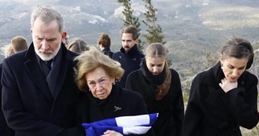 Η ισπανική βασιλική οικογένεια δημοσίευσε επίσημα φωτογραφίες από την ταφή, στις οποίες αποτυπώνεται η βασίλισσα Σοφία να αποχαιρετά σιωπηλά την αδελφή της και να κρατά την ελληνική σημαία που σκέπαζε το φέρετρο, εμφανώς συντετριμμένη, πλαισιωμένη από τα μέλη της οικογένειάς της.