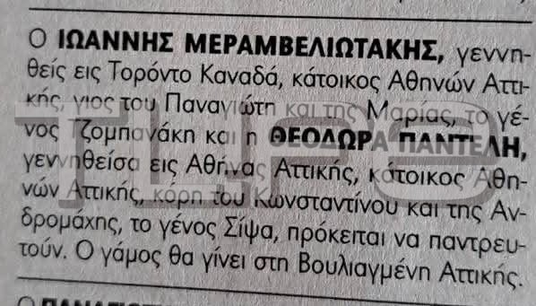 Το TLIFE εξασφάλισε και την αναγγελία γάμου του ζευγαριού στην οποία αναφέρεται, «Ο Ιωάννης Μεραμβελιωτάκης, γεννηθείς εις Τορόντο Καναδά, κάτοικος Αθηνών Αττικής, γιος του Παναγιώτη και της Μαρίας, το γένος Τζομπανάκη και η Θεοδώρα Παντέλη, γεννηθείσα εις Αθήνας Αττικής, κάτοικος Αθηνών Αττικής, κόρη του Κωνσταντίνου και της Ανδρομάχης, το γένος Σίψα, πρόκειται να παντρευτούν. Ο γάμος θα γίνειθ στη Βουλιαγμένη Αττικής.