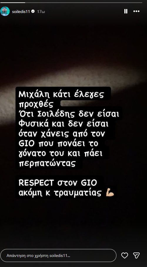Η απάντηση του Άρης Σοϊλέδη: «Μιχάλη κάτι έλεγες προχθές ότι Σοϊλέδης δεν είσαι. Φυσικά και δεν είσαι όταν χάνεις από τον Gio που πονάει το γόνατό του και πάει περπατώντας. Respect στον Gio ακόμη και τραυματίας», έγραψε στα social media ο Άρης Σοϊλέδης.