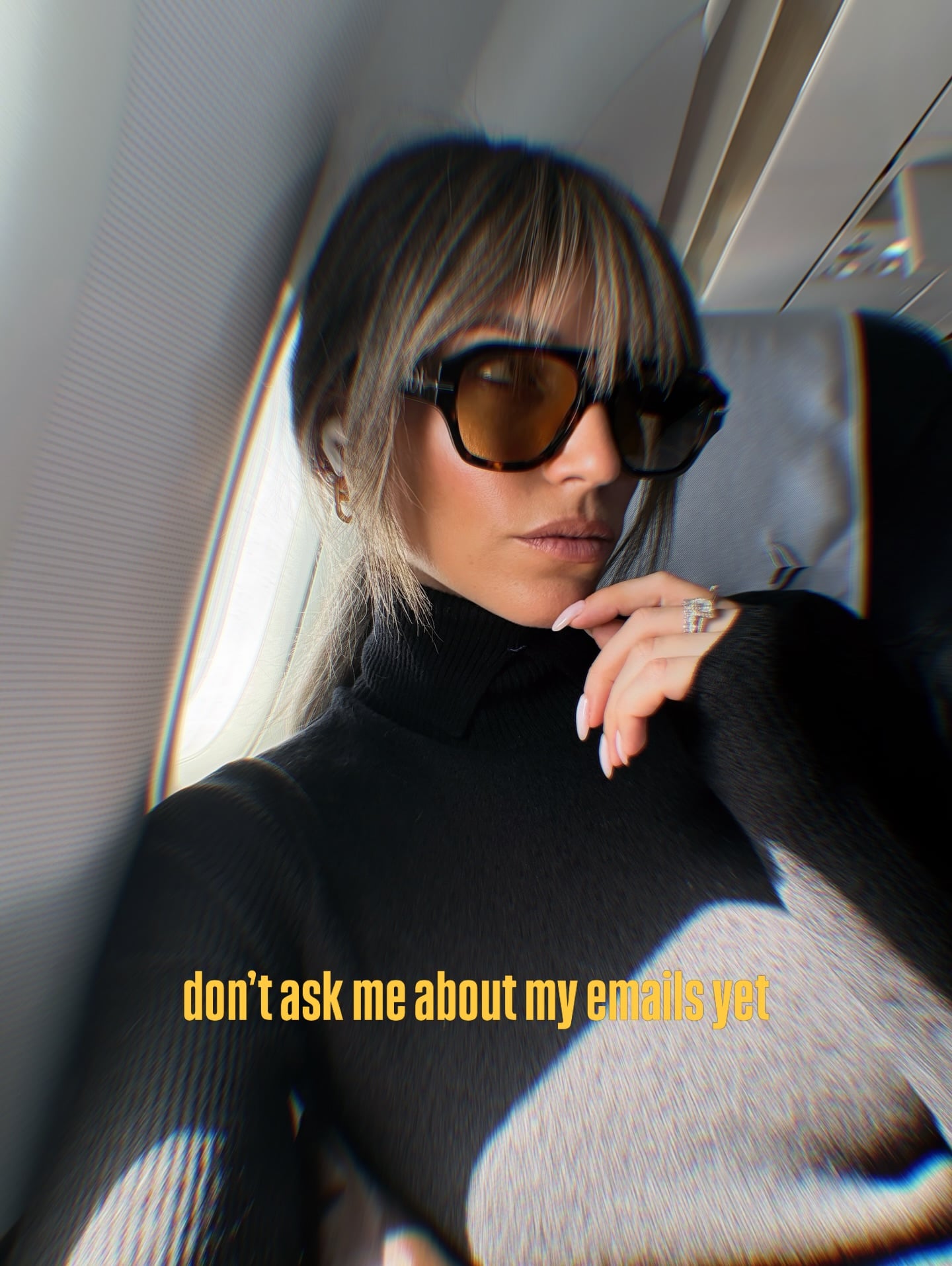 Στις φωτογραφίες που δημοσίευσε, η ηθοποιός εμφανίζεται μέσα σε αεροπλάνο, καθισμένη δίπλα στο παράθυρο, επιλέγοντας ένα κομψό και διαχρονικό σύνολο με μαύρο ζιβάγκο και γυαλιά ηλίου.