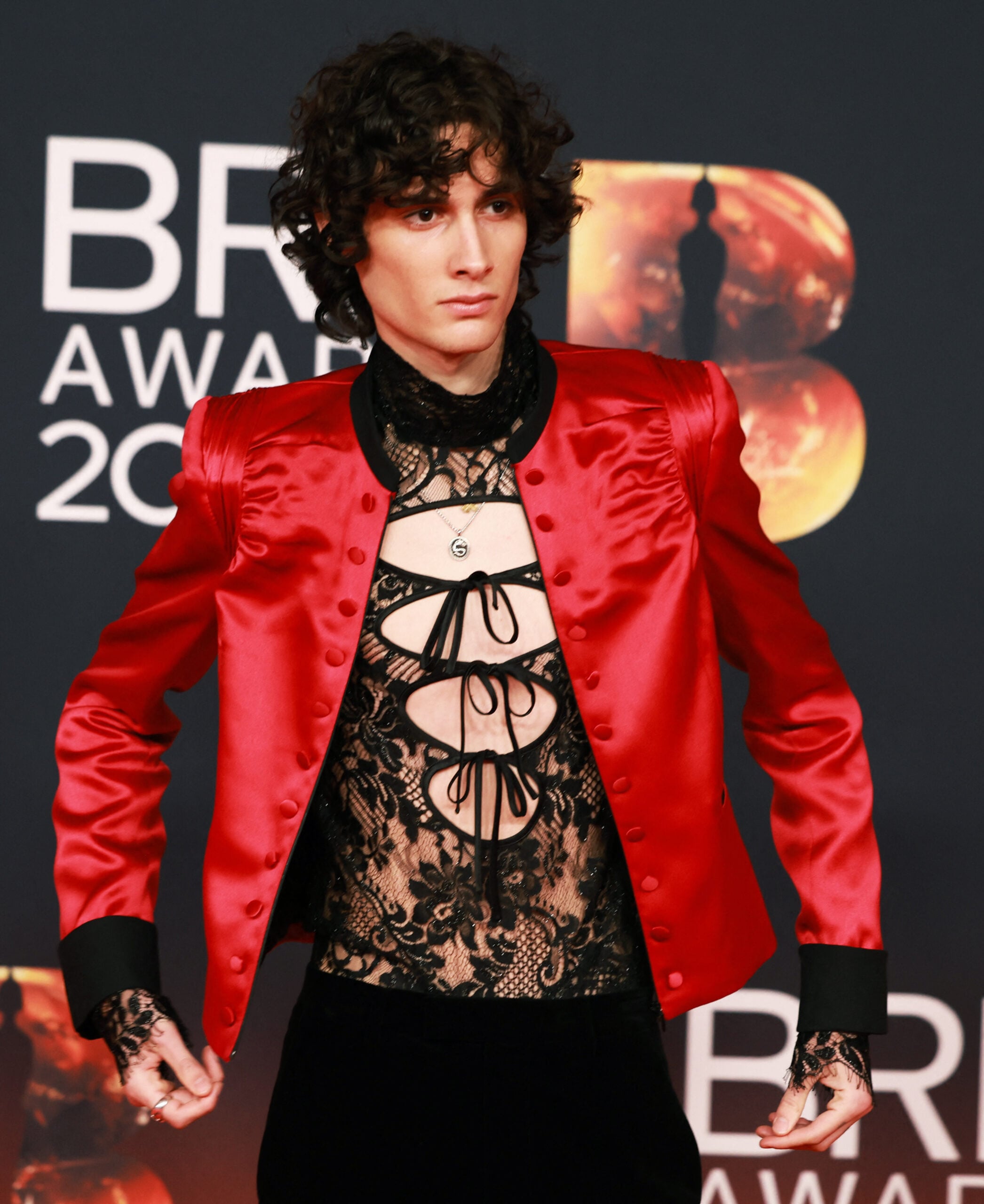 Ο Sombr επιλέγει ένα lace to και satin κόκκινο σακάκι.