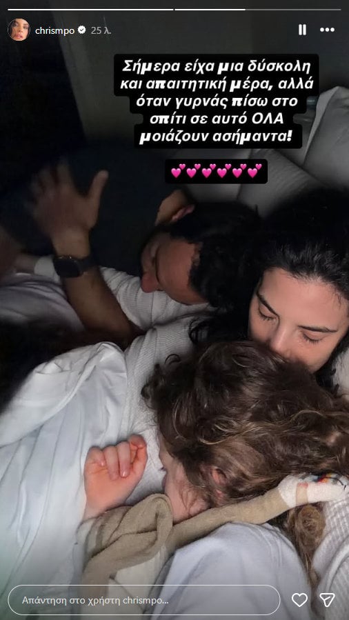 «Σήμερα είχα μια δύσκολη και απαιτητική μέρα, αλλά όταν γυρνάς πίσω στο σπίτι όλα μοιάζουν ασήμαντα», έγραψε η Χριστίνα Μπόμπα.