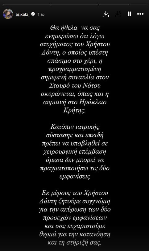Εκ μέρους του Χρήστου Δάντη ζητούμε συγγνώμη για την ακύρωση των δύο προσεχών εμφανίσεων και σας ευχαριστούμε θερμά για την κατανόηση και τη στήριξή σας», έγραψε η Ασημίνα Χατζηανδρέου για το ατύχημα του Χρήστου Δάντη.
