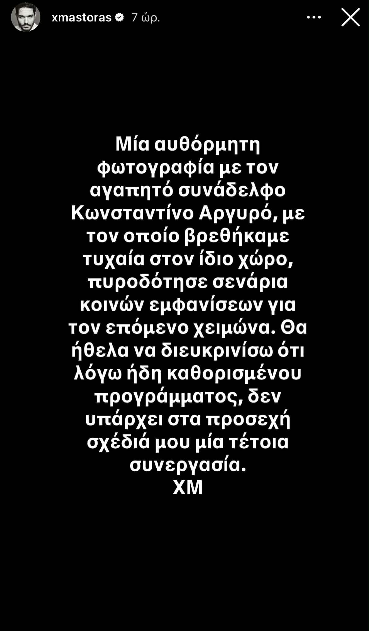«Μία αυθόρμητη φωτογραφία με τον αγαπητό συνάδελφο Κωνσταντίνο Αργυρό, με τον οποίο βρεθήκαμε τυχαία στον ίδιο χώρο, πυροδότησε σενάρια κοινών εμφανίσεων για τον επόμενο χειμώνα. Θα ήθελα να διευκρινίσω ότι λόγω ήδη καθορισμένου προγράμματος, δεν υπάρχει στα προσεχή σχέδιά μου μία τέτοια συνεργασία».