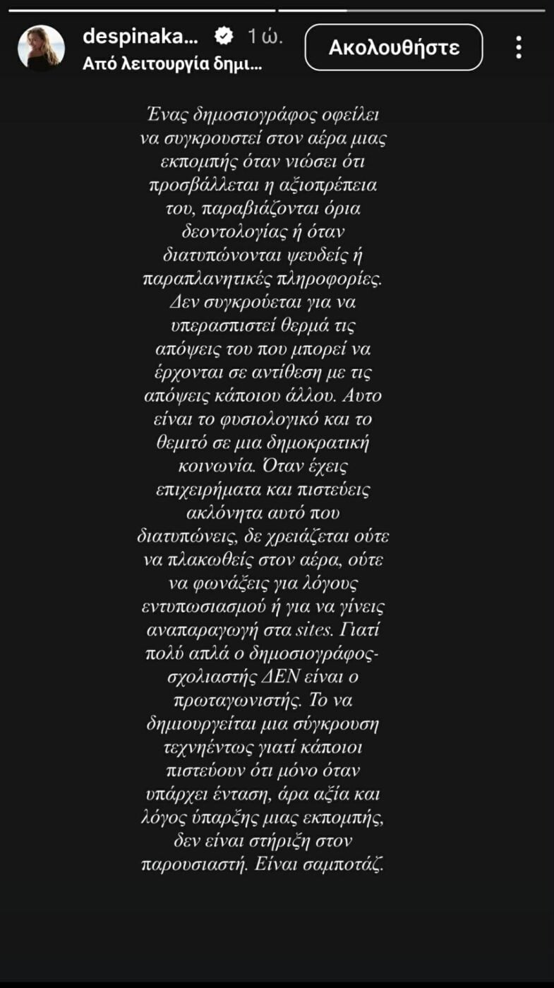 Η δημοσιογράφος και συνεργάτιδα του Γιώργου Λιάγκα στο «Πρωινό» έγραψε χαρακτηριστικά: