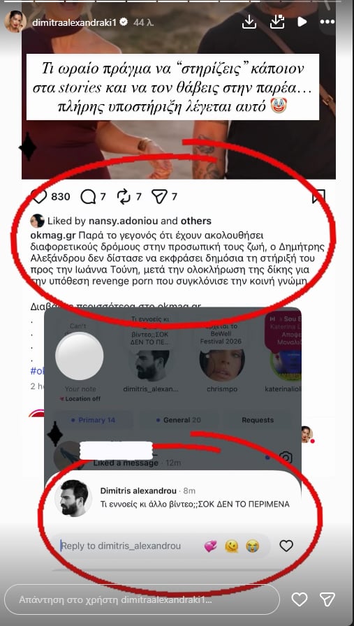 Ωστόσο, η πρώην φίλη του Δημήτρη Αλεξάνδρου και κολλητή της Ιωάννας Τούνη, φαίνεται πως θέλησε να δείξει δημόσια πως… μάλλον αυτή η στήριξη του πρώην μοντέλου είναι μόνο για το θεαθήναι. Πιο συγκεκριμένα, η Δήμητρα Αλεξανδράκη, είχε κρατήσει ένα screenshot από ένα μήνυμα που είχε κοινοποιήσει παλιότερα στο Instagram ο Δημήτρης Αλεξάνδρου τις ημέρες που είχε κυκλοφορήσει η είδηση ότι υπάρχει και άλλο αντίστοιχο βίντεο.