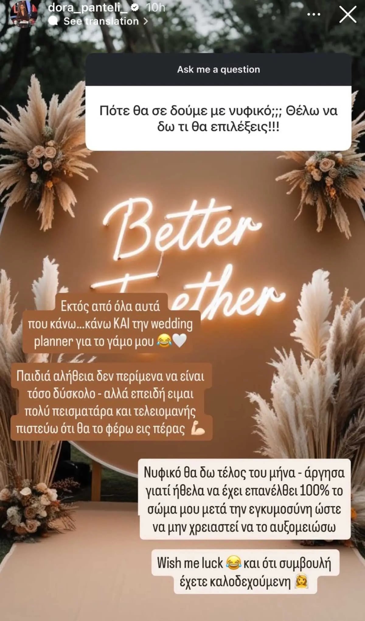 Να υπενθυμίσουμε ότι η Δώρα Παντέλη σε προηγούμενο q&a που είχε κάνει είχε αποκαλύψει ότι ο γάμος της θα γίνει το καλοκαίρι και συγκεκριμένα τον Ιούλιο, στο αγαπημένο της νησί.