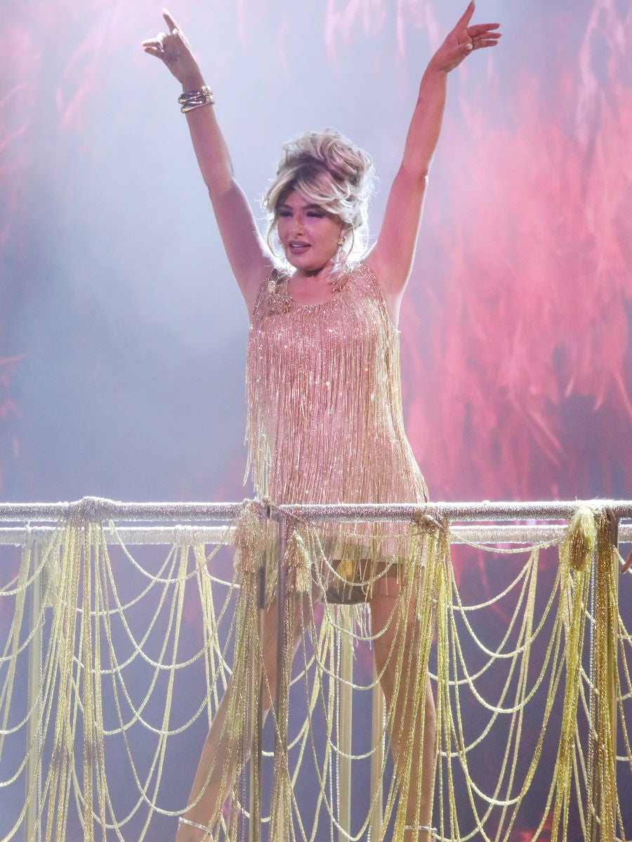 Η Έλενα Παπαρίζου κατά τη διάρκεια του σόου αλλάζει το στυλ της φορώντας ξανθιά περούκα αλλά και μαύρο καρέ.