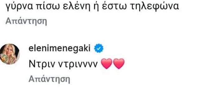 «Γύρνα πίσω Ελένη ή έστω τηλεφώνα» έγραψε το σχόλιο μια από τις followers της και η Ελένη Μενεγάκη απάντησε: «Ντριν ντριννν»
