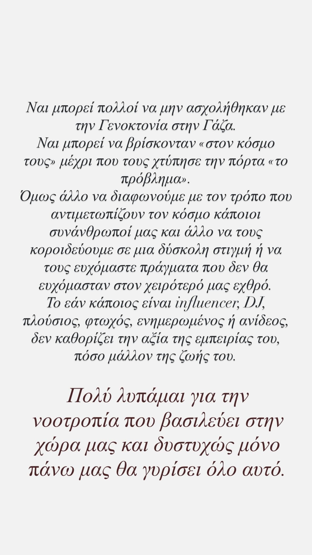 «Ναι μπορεί πολλοί να μην ασχολήθηκαν με την Γενοκτονία στην Γάζα. Ναι μπορεί να βρίσκονται “στον κόσμο τους” μέχρι που τους χτύπησε την πόρτα “το πρόβλημα”. Όμως άλλο να διαφωνούμε με τον τρόπο που αντιμετωπίζουν τον κόσμο κάποιοι συνάνθρωποί μας και άλλο να τους κοροϊδεύουμε σε μία δύσκολη στιγμή ή να τους ευχόμαστε πράγματα που δεν θα ευχόμασταν στον χειρότερό μας εχθρό.