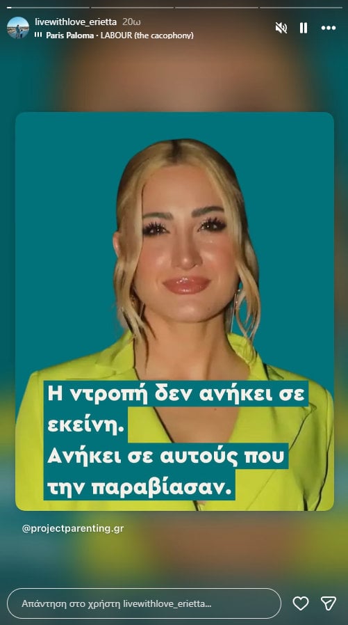 «Η ντροπή δεν ανήκει σε εκείνη. Ανήκει σε αυτούς που την παραβίασαν», ανέφερε το μήνυμα από ανάρτηση που αναδημοσίευσε η Εριέττα Κούρκουλου Λάτση στηρίζοντας την Ιωάννα Τούνη.