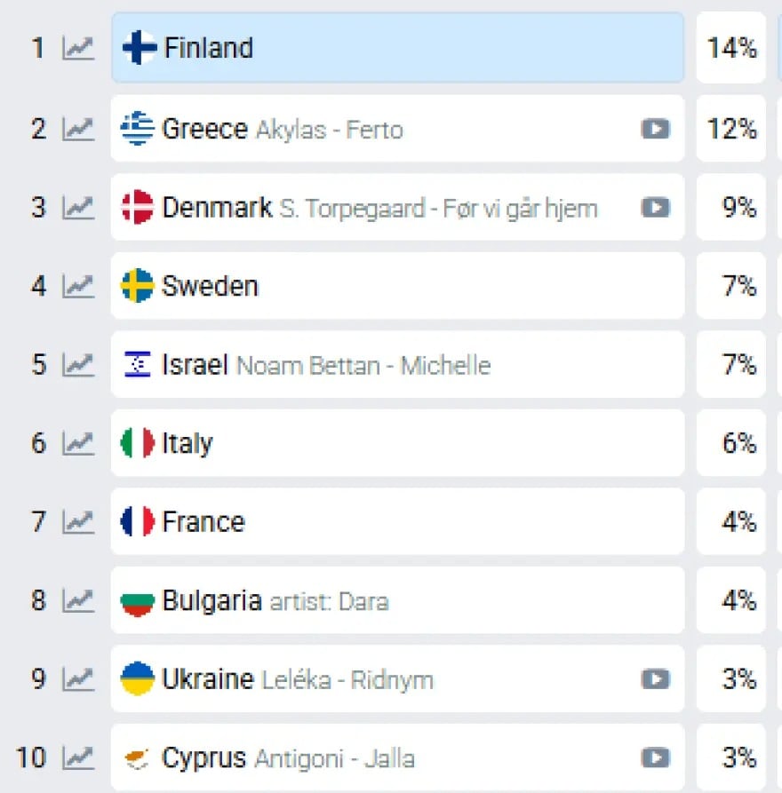Στην κορυφή των στοιχημάτων βρίσκεται η Φινλανδία με 14%, διατηρώντας μικρό αλλά σταθερό προβάδισμα.