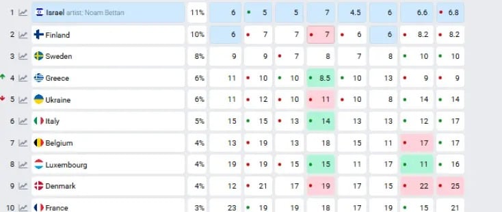 Στην κορυφή συναντούμε το Ισραήλ, χώρα που έχει καταφέρει να τερματίσει στην κορυφαία 5αδα τα τελευταία 3 χρόνια. Η προτίμηση για πρωτιά στην παρούσα στιγμή δεν συμπίπτει με την ύπαρξη τραγουδιού, αλλά με την υποστήριξη της χώρας από το televoting τα τελευταία χρόνια.