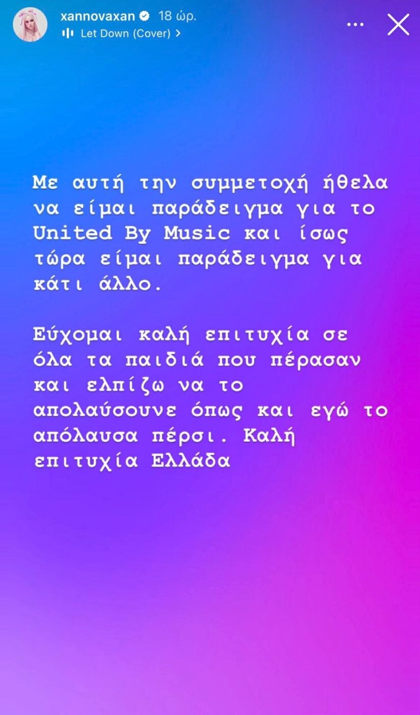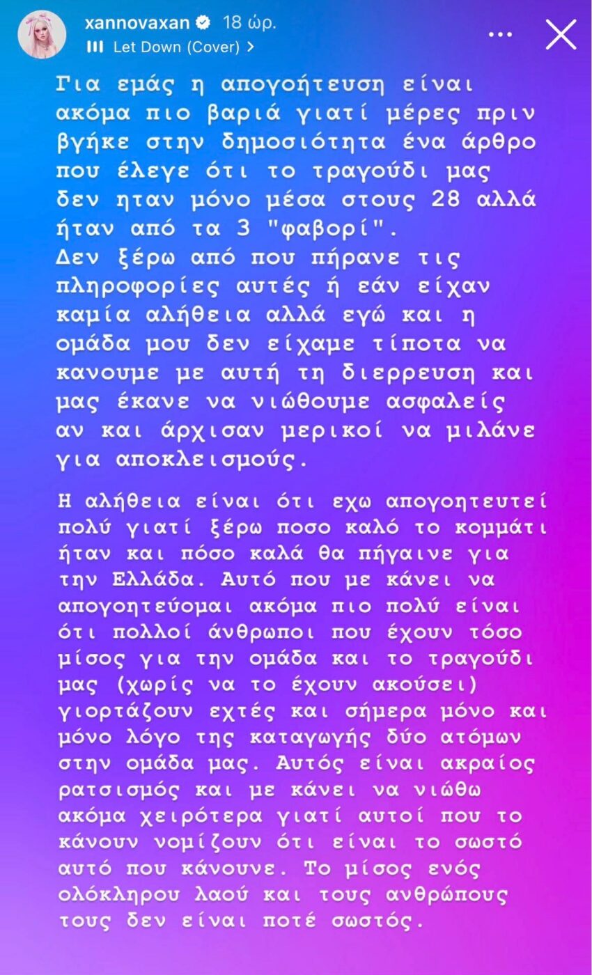 Με μία σειρά μακροσκελών αναρτήσεων στα social media, η Xannova Xan θέλησε να απαντήσει στα μηνύματα που έλαβε από τους θαυμαστές της αλλά και από τους haters της, σχετικά με τον αποκλεισμό του τραγουδιού που κατέθεσε στον εθνικό τελικό της Eurovision.